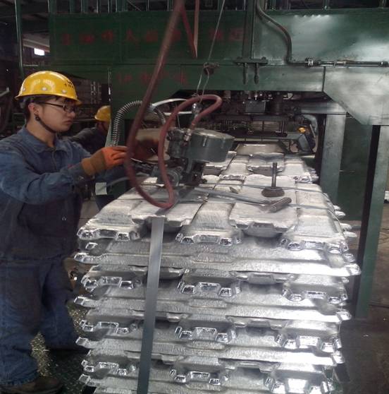 車(chē)間工人正在進(jìn)行成品鋁錠打包
